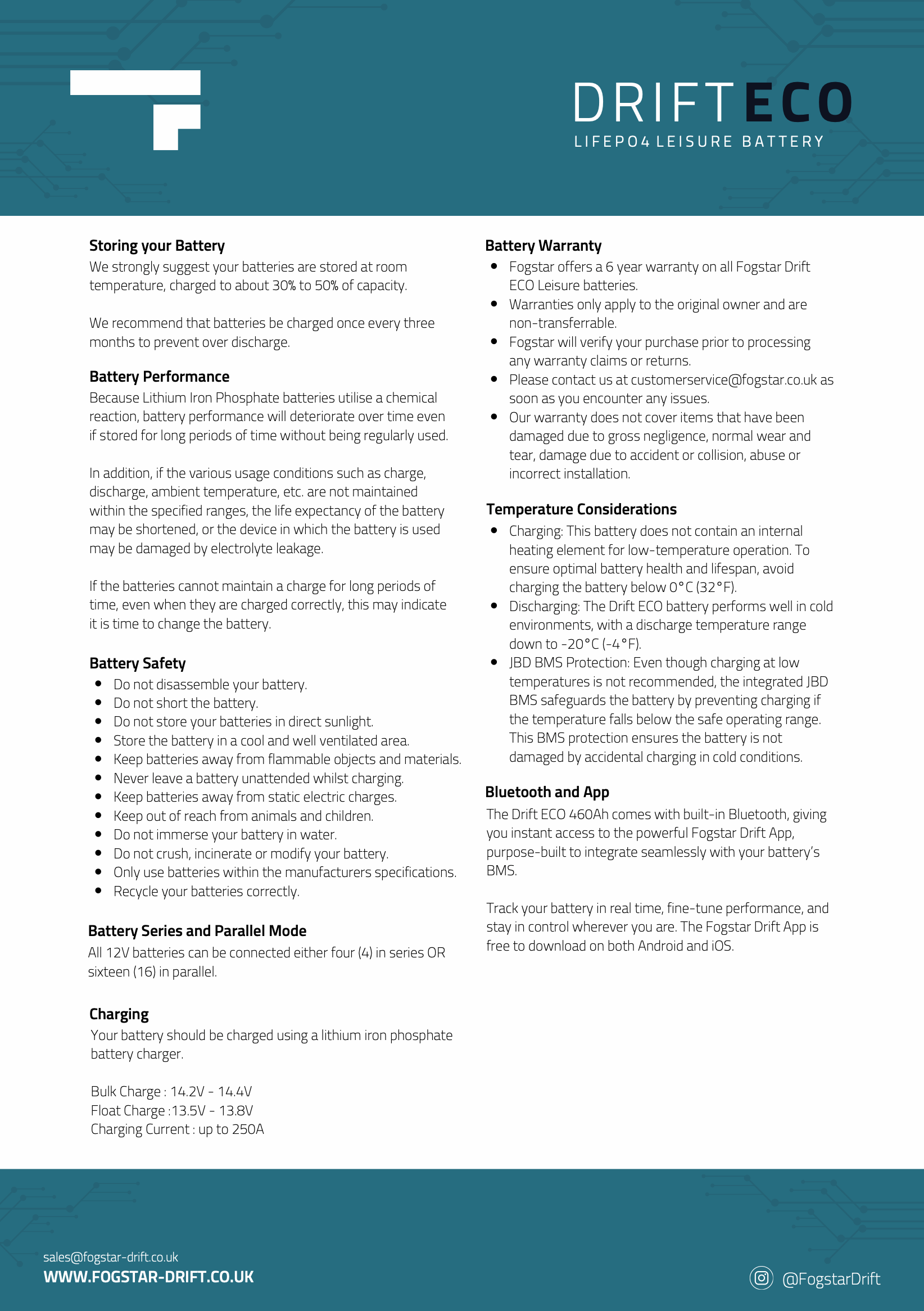 - Bluetooth Connectivity: Equipped with Bluetooth, this battery lets you monitor the state of charge and health directly through the Fogstar Drift app.